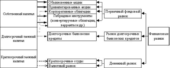 Типичное предприятие реального сектора как правило выступает в роли покупателя на финансовом рынке. Схема на рис. 4.2.1 показывает связь между предприятием и рынком, а также основные финансовые инструменты, эмитируя которые предприятие сможет приобретать на рынке необходимый капитал.