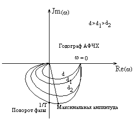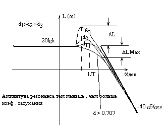 В зависимости от коэффициента затухания d, частотные характеристика колебательного звена может иметь максимум, если d < 0.707, или не иметь этого максимума, если d > 0.707