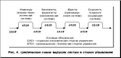 Каждая такая система в определенные периоды развития социальных целых может занимать доминирующее положение, характеризуя тем самым особенности различных частей организационной структуры управления (ведущее положение технико-технологических, организационно-правовых, экономических или социальных служб), а также господствующее положение в сфере социального управления представителей тех или иных управленческих профессий. При этом смена ведущих позиций представителей различных управленческих профессий соответствует, на наш взгляд, циклическому превалированию то организационно-технической, то социально-экономической сторон управления, а также одной из систем низшего уровня (рис.).