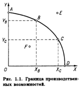 Возьмем точку F внутри области производственных возможностей. Очевидно, что она означает такую комбинацию средств производства и предметов потребления, которая существенно меньше, чем могло бы производиться при полном и эффективном использовании всех ресурсов. Выбрав такую точку, мы смирились бы либо с наличием неиспользованных ресурсов (например, с безработицей), либо с низкой эффективностью их использования (например, с большими потерями, в том числе и рабочего времени). Наоборот, точка Е характеризует такой выпуск продукции, который недостижим при полном использовании наличных ресурсов и существующей технологии.