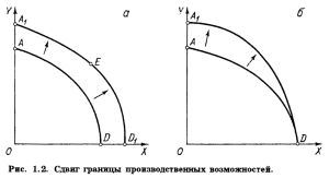 Если же нововведения будут осуществляться преимущественно в отраслях, производящих средства производства, расширение области производственных возможностей окажется сдвинутым влево, как показано на рис. 1.2, 6.