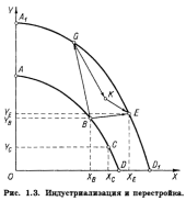 Заметим, что объем производства потребительских товаров в точке Е превышает весь возможный объем их выпуска при полном, стопроцентном использовании на эти цели всех ресурсов, которыми располагала страна до начала индустриализации, т.е. при прежней границе производственных возможностей (точка Е лежит правее точки D).