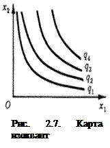 Через каждую точку плоскости ресурсов с координатами х 1, х 2 проходит единственная изокванта. Все изокванты имеют отрицательный наклон. Изокванта, отвечающая большему выходу продукта, располагается правее и выше изокванты для меньшего выхода.