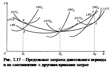 Кривая средних долгосрочных расходов (LRAC) представлена здесь как огибающая для всех возможных кривых средних краткосрочных расходов (SRAC 1 - SRAC 2 }. Каждой такой кривой SRAC соответствует и определенная кривая краткосрочных предельных расходов - SRMC (SRMC 1 - SRMC 2), пересекающая кривую долгосрочных предельных расходов (LRMC) в точках В, С, Е, соответствующих точкам касания кривых SRAC с огибающей их кривой LRAC (точки А, С, D).