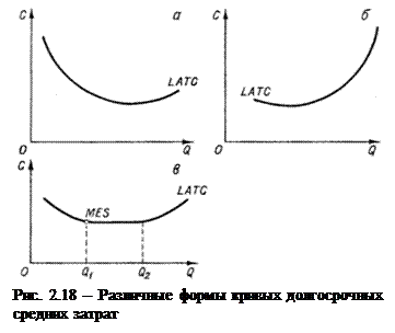 Как видно на рис.2.17, кривая LRAC имеет такую же U -образную конфигурацию, как и кривые SRAC, но с менее выраженной крутизной. Это значит, что средние долгосрочные расходы, как и краткосрочные, сначала снижаются, достигают минимума (точка С на рис. 2.17), а затем возрастают. Левая, снижающаяся ветвь LRAC характеризует экономичность от масштаба, правая, возрастающая - неэкономичность от масштаба. При этом симметричная (относительно точки минимума С) конфигурация кривой LRAC совсем необязательна.