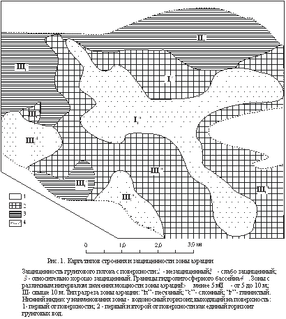 Итогом эколого-гидродинамического анализа особенностей строения зоны аэрации является районирование территории с построением специализированной карты – карты защищенности зоны аэрации (рис.1.). При ее построении используются следующие таксономические единицы: область, район, зона.