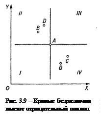 Б. Изобайды имеют отрицательный наклон (являются монотонно убывающими функциями). Пусть дана некоторая точка А (рис. 3.9), характеризующая определенную комбинацию товаров. Проведем через нее две взаимно перпендикулярные прямые. Очевидно, что все точки, лежащие в III квадранте, соответствуют большим, а все точки, лежащие в I квадранте, - меньшим количествам товаров X и Y, чем точка А. В соответствии с аксиомой ненасыщения точки, лежащие в III квадранте, более предпочтительны, а лежащие в I квадранте - менее предпочтительны, чем А. Следовательно, точки, безразличные А, например С, или В, или D, или G, должны находиться либо во II, либо в IV квадранте. И значит, изобайда должна иметь отрицательный наклон.