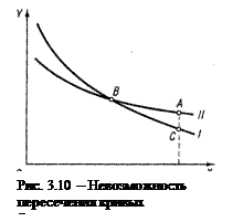 В. Изобайды никогда не пересекаются. Предположим противное. Пусть изобайды I и II на рис. 3.10 пересеклись в точке В. Из аксиомы о ненасыщении следует, что А > С. Наборы В и С лежат на одной изобайде I. Поэтому В ~ С. Наборы А и В лежат на одной изобайде II. Поэтому А ~ В. Из аксиомы о транзитивности следует, что А ~ С. Однако не могут одновременно быть А > С и А ~ С. Следовательно, изобайды не могут пересекаться.