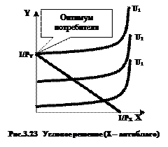 Исключительно угловым равновесие потребителя будет и тогда, когда одно из благ является антиблагом. В этом случае, как мы помним, изменяется сам характер изобайды – она становится кривой с положительным углом наклона или возрастающей кривой. Например, страдая избыточным весом потребитель вообще не хочет приобретать калорийного блага X, тогда ему будут предпочтительнее наборы, в которых блага X будет как можно меньше и равновесие осуществиться в точке, которая соответствует максимальному количеству некалорийного блага Y, которое он может приобрести в рамках бюджета (рис. 3.23).