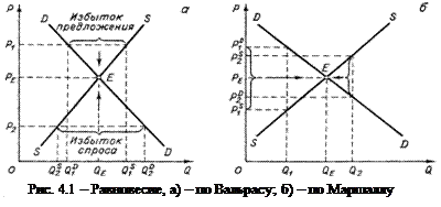 Равновесие по Маршаллу иллюстрирует рис. 4.1б. Если объем предложения ниже равновесного уровня QE, цена спроса выше цены предложения, например при Q 1 PD 1 > PS 1, что побуждает продавцов увеличить объем предложения.