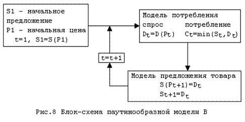 Концептуальная модель любого процесса динамики цен включает взаимодействие трех подсистем, которые можно условно назвать “товаропроизводитель”, “потребитель” и “рынок” (рис.4.2). Паутинообразная модель (модель А), в которой спрос отстает от предложения на один период: D(Pt+1)=S(Pt), также вписывается в схему рис.4.2.