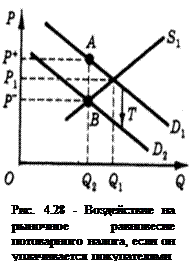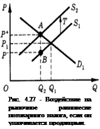 Рассмотрим рис. 4.27. Вначале, до введения налога, линия спроса занимала положение D1, а линия предложения - S1. Равновесная цена составляла P1, равновесный объем продаж - Q1.