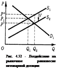 Рассмотрим рис. 4.32. Допустим, что линии спроса и предложения сначала занимали положения соответственно D1 и S1. Равновесный объем продаж составлял Q1, а равновесная цена - P1. Предположим, правительство ввело дотации из госбюджета производителям данного товара размером V грн. в расчете на единицу продукции. Это приведет к сдвигу линии предложения на V грн. вниз. Действительно, если ранее производители согласны были предложить на рынке количество товара, скажем, Q1 по цене P1, то теперь они согласятся предложить на рынке то же количество товара, если цена без дотации будет на V грн. ниже P1. В результате объем продаж увеличивается до Q2 цена для покупателей снижается до P-, цена, фактически получаемая производителями, повышается до P+.
