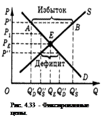 Рассмотрим рис. 4.33. Государство может установить фиксированную цену на уровне как превышающем цену равновесия (Р' > PE), так и ниже ее (Р" < PE). В первом случае это приведет к избытку продукции (Q'S - Q'D), во втором случае - к дефициту (Q''D - Q''S). В обоих случаях объем продаж будет ниже равновесного объема QE. В первом случае будет реализовано Q'D единиц продукции, во втором - Q''S..