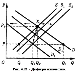 Рассмотрим рис. 4.35. Предположим, первоначально линия спроса на сосиски занимала положение D, линия предложения - положение S. Пусть цена сосисок зафиксирована государством на уровне Р, что ниже равновесной цены PE. Объем продаж при этом равен Q1, дефицит - Q2 - Q1.