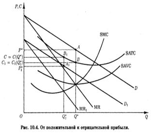 Обратимся к рис. 5.7, где D и MR - кривые спроса и предельной выручки монополиста, LRATC и LRMC - кривые его средних общих и предельных расходов долгосрочного периода. Наличные мощности монополии характеризуют кривые средних общих и предельных расходов краткосрочного периода SRATC1 и SRMC1. В этой ситуации, очевидно, оптимальный объем выпуска Q 1 Однако при таком объеме производства удельные (средние) общие расходы оказываются выше цены C 1 (Q 1) > P 1 (Q 1)) и монополия имеет убытки, размеру которых соответствует площадь прямоугольника P 1 C 1 E 1 A.