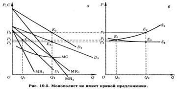 Поэтому концепция кривой предложения, как взаимооднозначного соответствия между ценами и объемами выпуска, в теории монополии, как и в теории рынков несовершенной конкуренции в целом, не используется. Говорят, что монополия не имеет кривой предложения. Для анализа поведения монополиста, как и других несовершенно конкурентных предприятий, решающее значение имеет соотношение спроса и расходов, а не спроса и предложения, что справедливо лишь для рынка совершенной конкуренции.