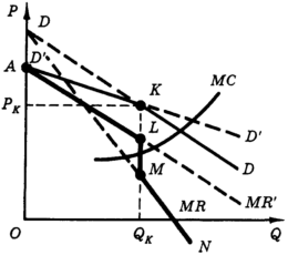 Предполагая, что конкуренты будут вести себя рационально, фирма будет воздерживаться от изменения первоначальной цены РK. И только значительное изменение затрат может склонить фирму к изменению цены. Это объясняется формой кривой предельной выручки (ALMN). Ломаной линии спроса соответствует разрывная ломаная линия предельной выручки, которая образована участками линий MR и, соответствующих отрезкам линий DD и D`D`, а также вертикальным отрезком LM, связанным с точкой излома K. Если кривая предельных затрат (МС) пересечет линию предельной выручки в точке вертикального участка, то оптимум фирмы будет достигаться при цене РK и объеме выпуска QK. Таким образом, сдвиг кривой MС выше или ниже положения, показанного на рисунке, не повлечет за собой изменения оптимальной комбинации цены и объема выпуска, если точка пересечения с линией предельной выручки не выйдет за пределы отрезка LM.