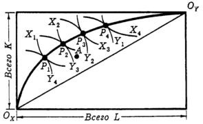 Любая точка в коробке представляет размещение обоих ресурсов между производством Х и Y. Местоположение парето-эффективных способов размещения K и L представлено точками (P1,..., P4) касания изоквант производства X (X1,..., X4) и изоквант производства Y (Y4,..., Y1). Множество всех таких точек касания образует линию OXOY, аналогичную контрактной кривой. Во всех точках линии OXOY предельные нормы замены для обоих продуктов равны.
