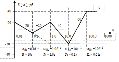 Не менее интересной представляется и обратная задача, часто встречающаяся при синтезе САР, - нахождение передаточной функции системы по ее заданной ЛАЧХ. Допустим, на рис. III. 43 представлена ЛАЧХ системы, передаточную функцию которой необходимо определить.