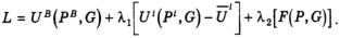 Из всех решений (способов размещения ресурсов), удовлетворяющих этому уравнению, требуется выбрать такое решение, которое приведет к максимизации полезности данного потребителя (пусть это будет индивид B, как и в приведенном выше примере) при заданном уровне полезности всех остальных потребителей и заданных производственных возможностях экономики. Запишем соответствующее уравнение Лагранжа: