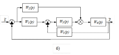 Говорят, что многоконтурная САР имеет перекрещивающиеся связи, если контур обратной или параллельной связи. На рис. II.21.а перекрещивающихся связей нет, а на рис. II.21б звено W3(р), принадлежащих параллельному контуру W 1 (p), W 2 (p), W 3 (p), одновременно принадлежит контуру обратной связи W 3 (p), W 4 (p), W 5 (p) (т.е. охватывается контуром обратной связи).