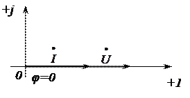 в цепи представлены векторами на комплексной плоскости. Начала векторов совмещены с началом координат, длины векторов в соответствующем масштабе равны действующим значениям напряжения и тока. Вещественная ось направлена горизонтально, а мнимая – вертикально. Начальный вектор совмещаем с положительным направлением вещественной оси. Для цепи с активным сопротивлением векторы напряжения и тока совпадают по направлению.