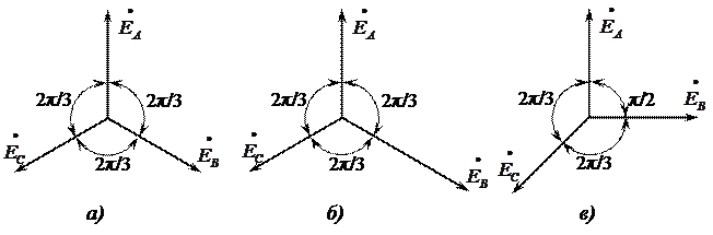 Если ЭДС не равны по значению или сдвинуты друг относительно друга на угол, не равный 120º, то такая система ЭДС называется несимметричной. Аналогично определяются трехфазные системы напряжений и токов.