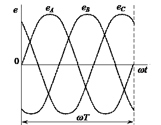 Максимальные (амплитудные) значения всех ЭДС и их частоты будут одинаковыми, так как число витков фазных обмоток одинаково и ЭДС индуцируется одним потоком Ф0. Изменение фазных ЭДС еА, еВ и еС показано на рисунке.