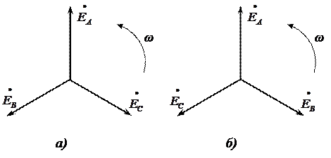 При равных амплитудах действующее значение ЭДС всех фаз равны. При сдвиге по фазе на 2 π /3 они образуют симметричную систему. Если при условном положительном направлении вращения векторов (против часовой стрелки) вектор ЭДС