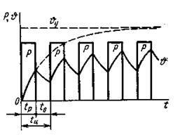 Показанное на этом же рисунке изменение превышения температуры υ двигателя представляет собой линию, состоящую из чередующихся отрезков нагрева в периоды работы двигателя под нагрузкой и охлаждения в периоды пауз. В каждый следующий период работы двигателя температура его увеличивается, но не достигает установившегося значения.