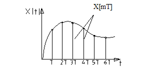 Фиксируем моменты времени T1...T5 и фиксируем ординаты сигнала. (Т-период квантования, интервал дискретизации).