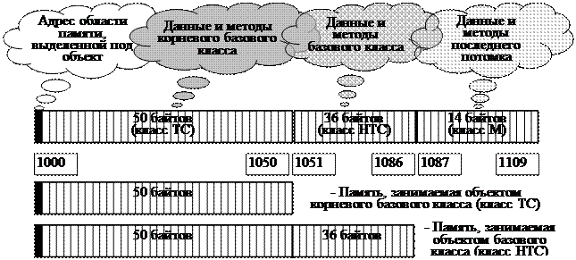 Анализируя структуру содержимого области памяти, выделенной под объект типа мотоцикла, можно обнаружить следующую особенность. Вначале эта область заполняется элементами корневого базового класса ТС, после чего – элементами базового класса НТС и только после этого оставшиеся ячейки памяти заполняются элементами, объявленными в классе последнего потомка (мотоцикла). Именно в такой последовательности и осуществляется выделение памяти под экземпляр любого класса, являющегося потомком других классов. В том же порядке вызываются и конструкторы его базовых классов. А это, в свою очередь, означает, что в выделенной области памяти содержатся не один, а три объекта: экземпляр класса мотоцикла, экземпляр класса наземного транспортного средства и экземпляр класса транспортного средства. Но это так и должно быть потому, что мотоцикл действительно является частным случаем понятия наземного транспортного. В свою очередь, наземное транспортное средство тоже является частным случаем еще более общего понятия – транспортное средство. Отсюда легко придти к заключению о том, что, при необходимости, из экземпляра класса-потомка можно всегда выделить ту его часть, которая полностью копирует все элементы ее базового класса.