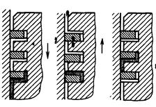 Во время движения поршня вниз кольца прижимаются к верхним торцам поршневых канавок, и масло со стенок цилиндра поступает в нижние торцовые зазоры. При обратном движении поршня кольца перемещаются в канавках и выдавливают масло через радиальный зазор в верхний торцовый зазор и далее в пространство над кольцами.