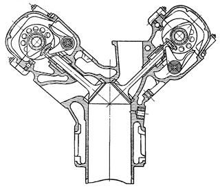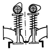 Рис. 2.6. Расположение двух верхних клапанов в один ряд | В дизелях трубопроводы часто располагаются по обе стороны головки, при этом уменьшается подогрев воздуха, что повышает коэффициент наполнения. Привод клапанов может быть осуществлен или непосредственно от верхнего распределительного вала, расположенного над ними (рис. 2.7), или от нижнего вала, размещенного в блоке или в верхней половине картера через толкатели, штанги и коромысла (рис. 2.8). Последний вариант находит широкое применение в двухрядных V-образных двигателях, в которых от одного распределительного вала, расположенного в развале блоков, приводятся в движение клапаны всех цилиндров. |