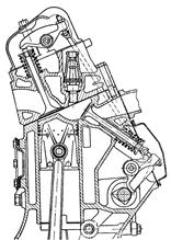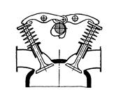 Рис. 2.7. Верхнее расположение клапанов, верхнее положение распредвала (OHС) Рис. 2.8. Верхнее расположение клапанов, нижнее положение распредвала (OHV) | В двигателях с воздушным охлаждением при таком расположении клапанов имеются большие возможности для оребрения выпускных патрубков. Однако расположение клапанов в два ряда затрудняет размещение форсунки в цилиндре и доступ к ней, в связи с чем в дизелях с жидкостным охлаждением такое расположение, как правило, не применяется. Привод к клапанам при двухрядном их расположении усложняется. Для непосредственного привода требуются два верхних вала на блок, помещаемых над клапанами (рис. 2.10). При одном верхнем вале нужна система рычагов (рис. 2.11). В случае нижнего расположения вала приходится применять систему рычагов (рис. 2.12) или приводить каждый из рядов клапанов от отдельных валов, располагая их по обе стороны блока. |