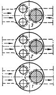 При установке трех клапанов в цилиндре – одного большого и двух меньшего размера (рис. 2.18) – может быть увеличена относительная площадь клапанов даже по сравнению с четырьмя клапанами. Выпускным может быть большой клапан (рис. 2.18а) или два меньших (рис. 2.18б). При наличии трех клапанов в головке цилиндра размещение форсунки затруднено.