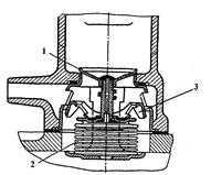 На рис. 3.3 представлен термостат сильфонного типа. Он состоит из корпуса 2, гофрированного цилиндра (сильфона), клапана 1 и штока, соединяющего сильфон с клапаном.Сильфон изготовлен из тонкой латуни и заполнен легкоиспаряющейся жидкостью (например, эфиром или смесью этилового спирта и воды). Расположенные в корпусе термостата окна 3 в зависимости от температуры охлаждающей жидкости могут или оставаться открытыми, или быть закрытыми клапанами.