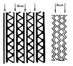 В пластинчатых радиаторах охлаждающая решетка (рис. 3.5б) устроена так, что охлаждающая жидкость циркулирует в пространстве, образованном каждой парой спаянных между собой по краям пластин. Верхние и нижние концы пластин, кроме того, впаяны в отверстия верхнего и нижнего резервуаров радиатора. Воздух, охлаждающий радиатор, просасывается вентилятором через проходы между спаянными пластинами. Для увеличения поверхности охлаждения пластины обычно выполняют волнистыми. Пластинчатые радиаторы имеют большую охлаждающую поверхность, чем трубчатые, но вследствие ряда недостатков (быстрое загрязнение, большое количество паяных швов, необходимость более тщательного ухода) применяются сравнительно редко.