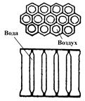 Сотовый радиатор относится к радиаторам с воздушными трубками (рис. 3.5в). В решетке сотового радиатора воздух проходит по горизонтальным, круглого сечения трубкам, омываемым снаружи водой или охлаждающей жидкостью. Чтобы сделать возможной спайку концов трубок, края их развальцовывают так, что в сечении они имеют форму правильного шестиугольника.