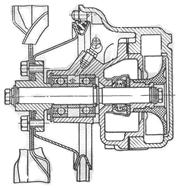Ременную передачу можно применять и при установке центробежного насоса отдельно от вентилятора. В некоторых двигателях грузовых автомобилей и тракторов привод водяного насоса осуществляется от коленчатого вала шестеренчатой передачей. Вал центробежного водяного насоса устанавливают обычно на подшипниках качения и снабжают для уплотнения рабочей поверхности простыми или саморегулирующимися сальниками.