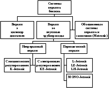 В настоящее время впрыскивающие топливные системы классифицируются по различным признакам: по месту подвода топлива; по способу подачи топлива; по способу регулирования количества смеси. Классификация систем впрыска представлена на рис. 5.20.
