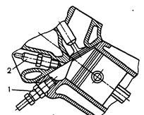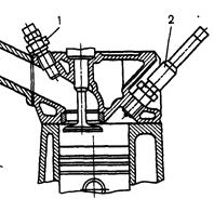 На рис. 5.21 показаны варианты расположения форсунок для впрыска бензина. При впрыске бензина в цилиндр (рис. 5.21а) топливо впрыскивается форсункой 1 непосредственно в цилиндр под давлением 3–3.8 МПа. Воспламенение топливной смеси происходит за счет свечи зажигания 2. Во впускной трубопровод (рис. 5.21б) бензин впрыскивается форсункой 1 под низким давлением (0.15–0.2 МПа).