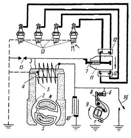 Принципиальная схема магнето с вращающимся магнитом показана на рис. 8.8. Магнитом (ротором) является двухполюсный магнит, вращающийся вокруг своей продольной оси между полюсными башмаками 2 стоек сердечника 3. Железный сердечник с двумя стойками имеет П-образную форму и соединен с массой. На сердечнике намотаны две обмотки: первичная 4 и вторичная 5. Первичная обмотка 4 припаяна одним концом к сердечнику 3,а другим – к неподвижному контакту 6 механического прерывателя. Вторичная обмотка 5 одним концом соединена с первичной, а другим – через центральный контакт и угольную щетку 7 с токоприемником вращающегося электрода. Последний закреплен на барабане (роторе) распределителя. Рычажок 8 подвижного контакта механического прерывателя соединен через пружину с массой. Кулачок 9 механического прерывателя закреплен при помощи винта на магните и вращается вместе с ним. Параллельно контактам механического прерывателя включен конденсатор 10. Барабан (ротор) распределителя вращается между двумя секторами 12 статора. В секторы статора запрессованы неподвижные электроды, к клеммам которых подключены провода от свечей 13. Магнит (ротор) 1 приводится во вращение от двигателя, а барабан распределителя – шестеренчатой передачей от ротора магнита. Выключение зажигания производится выключателем 14. При выключении первичная обмотка замыкается на массу, минуя прерыватель. Искровой промежуток 15 служит для предохранения изоляции вторичной обмотки от повреждения в тех случаях, когда напряжение значительно возрастает.