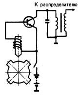 В электронной контактной системе зажигания в цепи прерывателя возникает слабый ток базы – ток управления транзистором, в результате чего значительно улучшаются условия работы контактов прерывателя. Таким образом, появляется возможность увеличения силы тока в цепи первичной обмотки катушки зажигания. Управление током базы выполняют датчики импульсов.