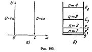 Рассмотрим поведение частицы в одномерной прямоугольной потенциальной яме ширины a с бесконечно высокими стенками. В интервале от 0 до а будем считать,что потенции.энергия=0,а вне этого интервала потенциальная энергия бесконечна.