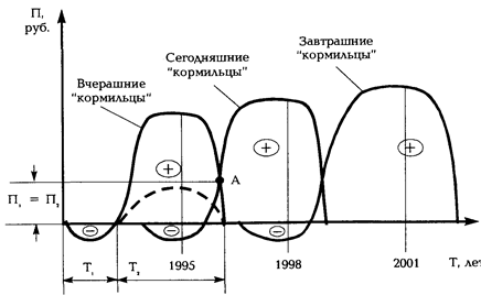 На рис. 4.6 показана динамика сменяемости и прибыльности моделей товара одного назначения (наименования). Названия циклов — вчерашние "кормильцы", сегодняшние "кормильцы", завтрашние "кормильцы" — заимствованы из работы Е. В. Деминой. На схеме показан пример воспроизводства моделей товара с применением воспроизводственного подхода, т. е. для поддержания конкурентоспособности модели каждая будущая модель прибыльнее вчерашней.