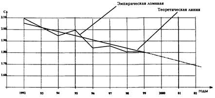 По полученным точкам построим теоретическую линию снижения себестоимости выработки сжатого воздуха в условиях данного завода. Участок от 2000 до 2002 г. является прогностическим, и он обозначен пунктирной линией. За год в среднем себестоимость снижается на 1,8%.