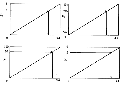 Система баллов строится следующим образом. Допустим,что установленные в табл. 5.3 весомости параметров характерны для группы приборов одного назначения: X1 — количество измеряемых параметров, Х2 — точность измерений, %, Х3 — пределы измерений основного параметра, Х4 — количество измерений в единицу времени. Максимальные значения параметров для данной группы приборов следующие: X1 — 4, Х2 — ± 5%, Х3 — 100 и Х4 — 6 измерений в минуту. По этим значениям параметров и их весомости (см. табл. 5.3) строится система баллов для прогнозирования полезного эффекта новых приборов данного класса (рис. 5.2).