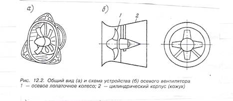 Осевые вентиляторы представляют собой расположенные в цилиндрическом кожухе (обечайке) лопаточное колесо, при вращении которого поступающий через входное отверстие воздух под воздействием лопаток перемещается между ними в осевом направлении.